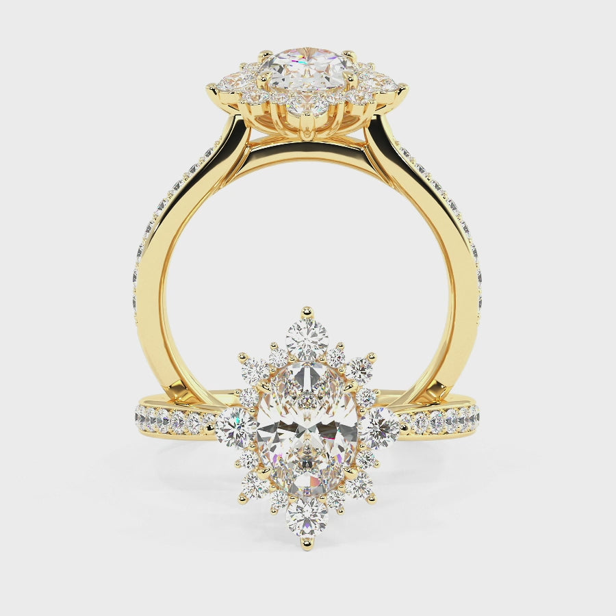 The Heather engagement ring features a stunning white diamond three-stone design, complemented by a starburst halo and pave accents for added sparkle. Crafted in your choice of five luxurious 18K gold colors—White, Rose, Yellow, Blackened, and Platinum—this exquisite piece is perfect for symbolizing timeless love and elegance.