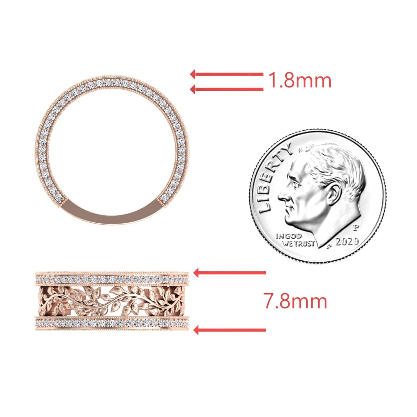 The Casey eternity band showcases a beautiful vine motif intricately set with sparkling round white diamonds that encircle the entire band. Crafted in your choice of four exquisite 14k gold options – white gold, romantic rose gold, traditional yellow gold, or modern blackened gold – this ring offers a unique and nature-inspired symbol of everlasting love.
