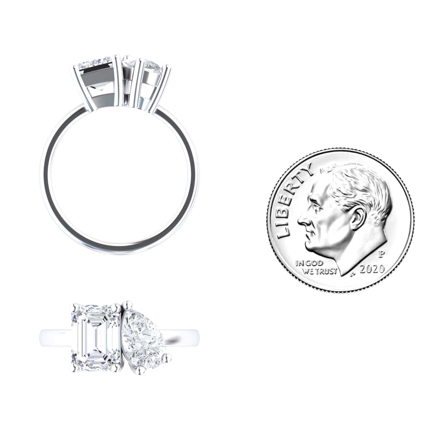 The Ellen Toi et Moi ring showcases a dazzling emerald-cut Moissanite paired with a pear-shaped Moissanite for a timeless duet of brilliance and elegance. Offered in 14K White, Rose, Yellow, and Blackened Gold, this two-stone design symbolizes love and duality in modern form.